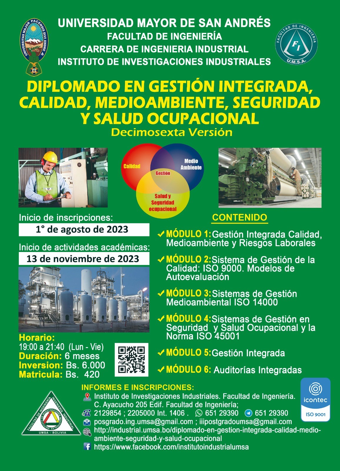 El Instituto de Investigaciones Industriales presenta la Décimo Quinta Versión del Diplomado en Gestión Integrada, Calidad, Medioambiente, Seguridad y Salud Ocupacional, que pretende formar a directivos, funcionarios en general y gerentes en la implementación, diseño y auditoria de sistemas de gestión integrada en las empresas, Programa de Postgrado de Ingeniería Industrial de la Facultad de Ingeniería de la Universidad Mayor de San Andrés.