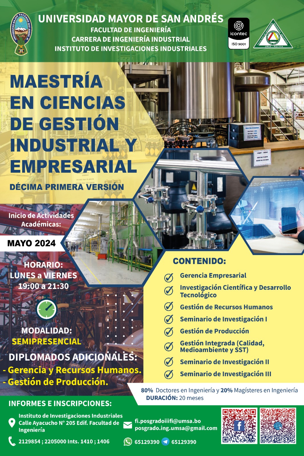 El Instituto de Investigaciones Industriales presenta la Décimo Quinta Versión del Diplomado en Gestión Integrada, Calidad, Medioambiente, Seguridad y Salud Ocupacional, que pretende formar a directivos, funcionarios en general y gerentes en la implementación, diseño y auditoria de sistemas de gestión integrada en las empresas, Programa de Postgrado de Ingeniería Industrial de la Facultad de Ingeniería de la Universidad Mayor de San Andrés.